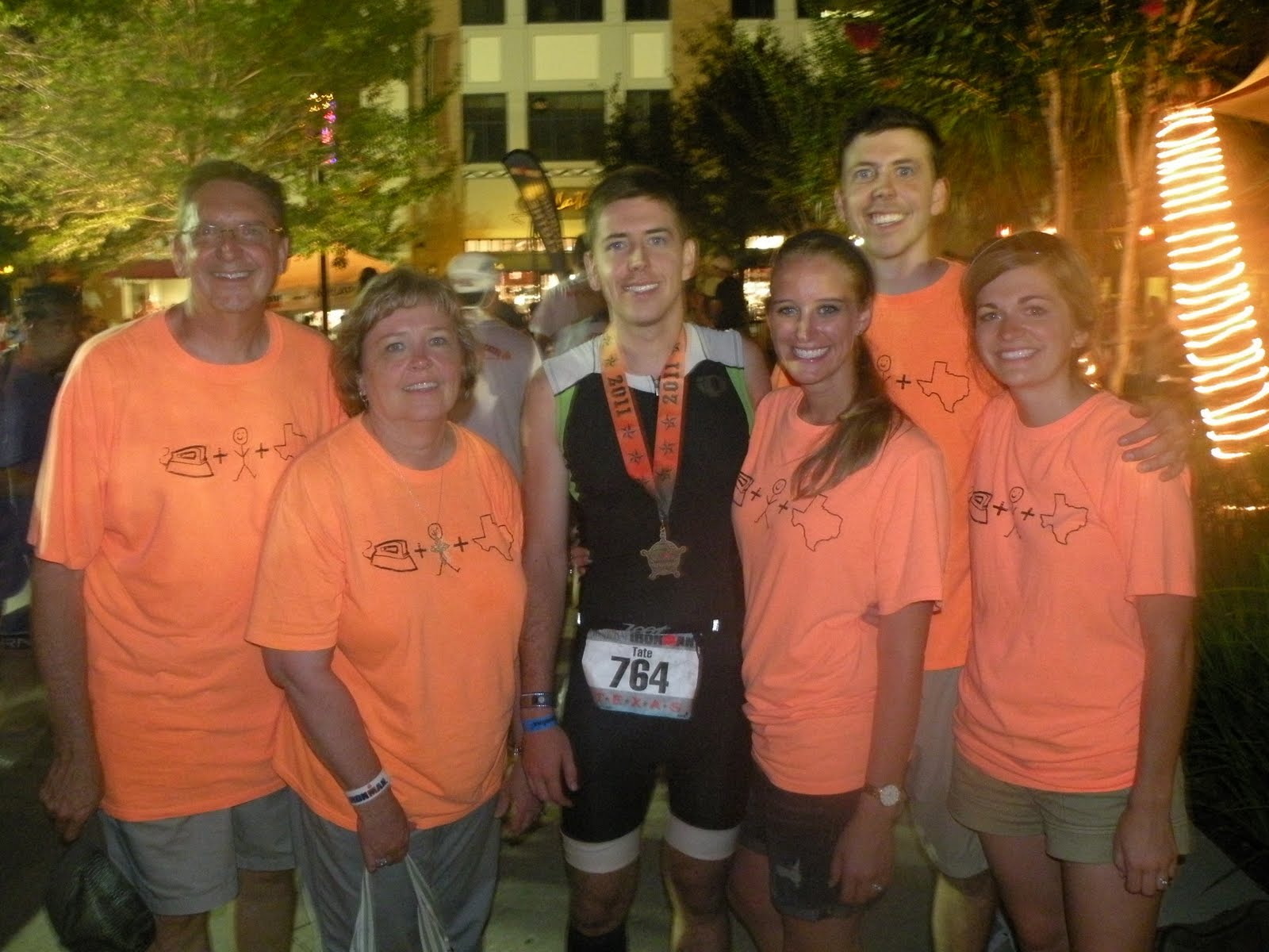 Sometime after 3:00 PM Dad and Tate finish the bike route. They go through the transition area and begin their "cool down" {aka Marathon}. That's right, the last leg of the Ironman is a 26.2 mile run. Dad previously ran a marathon a year or so ago, but this would be the farthest Tate has ever run. The Barrett/Nicholson Support Crew positioned ourselves at different points along the run so the guys could be cheered for twice. We were easy to spot in our neon orange shirts. That and we were pretty loud.